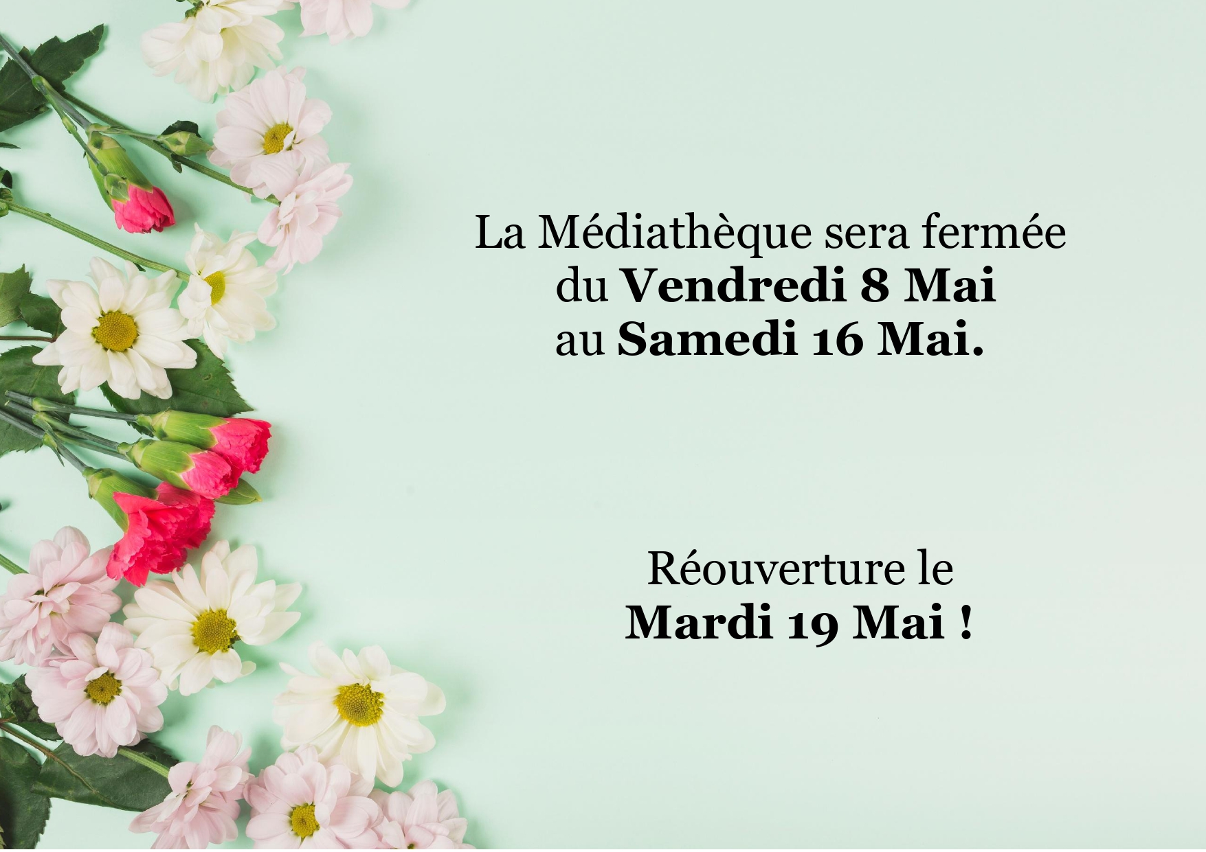 La Médiathèque sera fermée du Vendredi 8 Mai au Samedi 16 Mai.