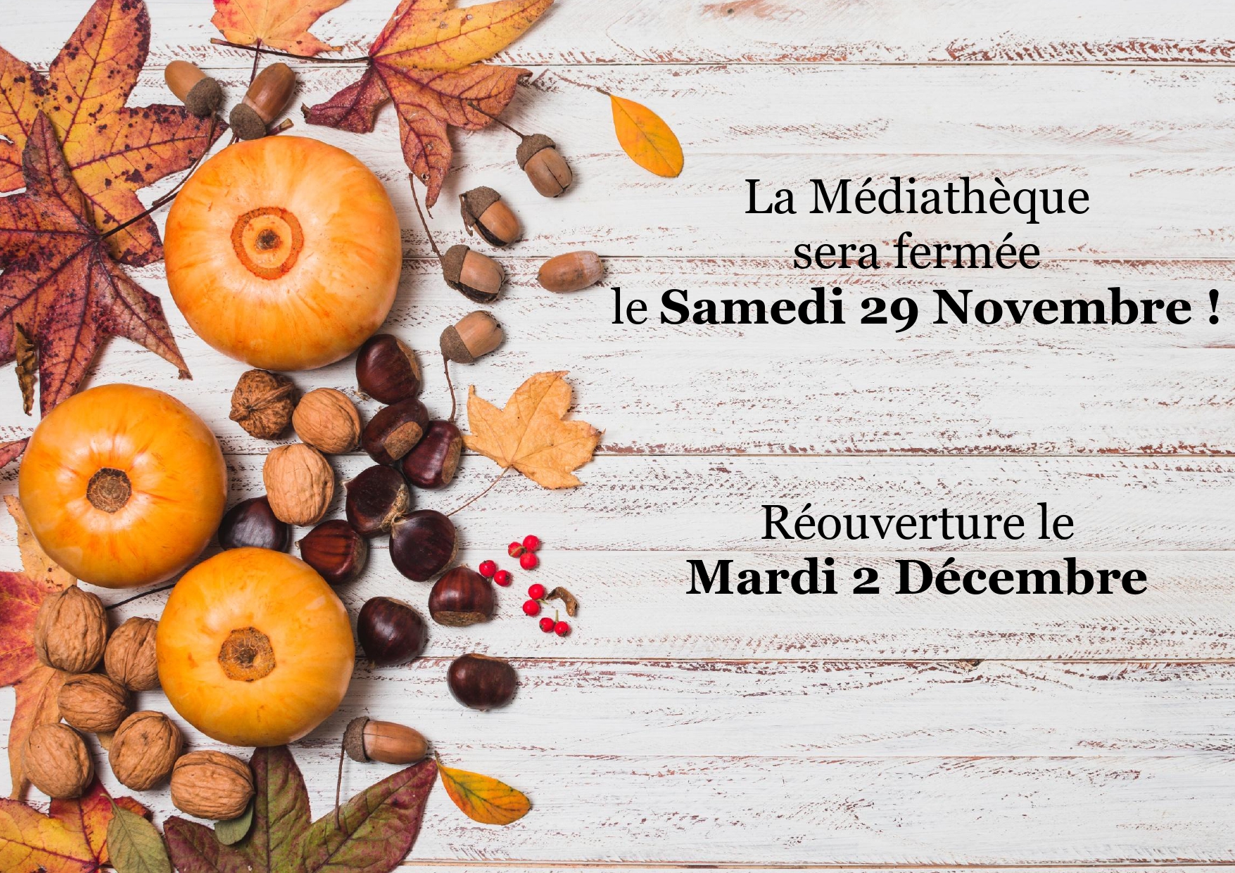 La médiathèque sera fermée le Samedi 29 Novembre.