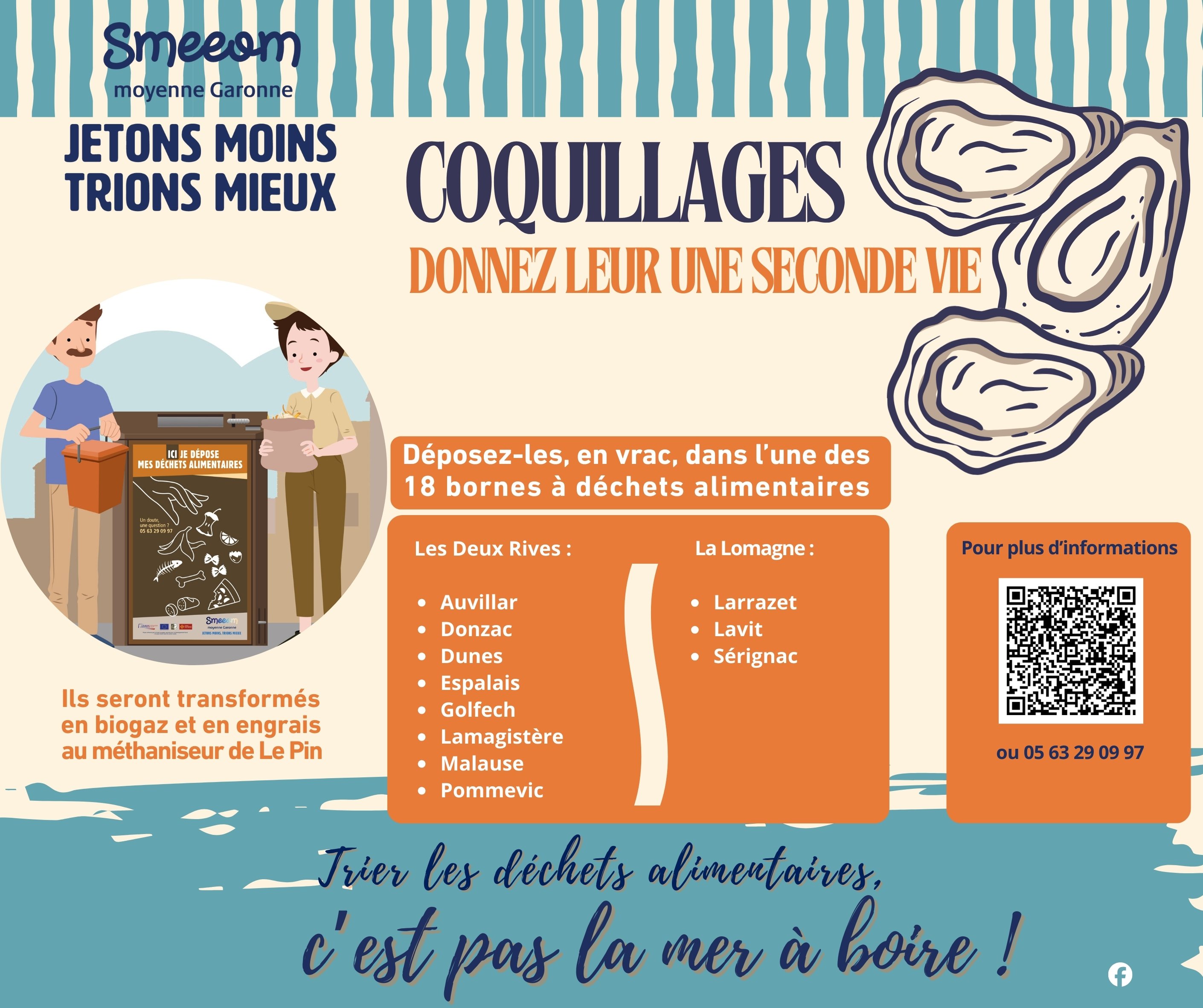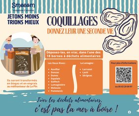 A la veille des fêtes de fin d’année, nous lançons une action de sensibilisation pour inciter les citoyens à déposer leurs coquilles d’huîtres et autres coquillages dans les bornes destinées aux déchets alimentaires, situées sur Auvillar, Donzac, Dunes, Espalais, Golfech, Lamagistère, Larrazet, Lavit, Malause, Pommevic et Sérignac. Ces déchets sont ensuite valorisés par méthanisation à Garonne Biogaz, à La Pin, contribuant ainsi à produire de l’énergie renouvelable et un amendement pour les parcelles agricoles voisines !