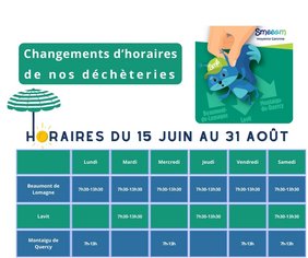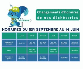 Suite à l’approbation lors du comité syndical du 19/12/2025, les horaires des déchèteries de Beaumont de Lomagne, Lavit et Montaigu de Quercy ont évolué à compter du 2 janvier 2026.